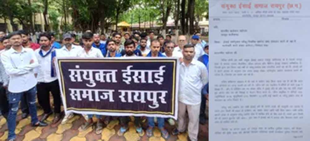 ईसाई धर्मानुसार घरेलू नियमित प्रार्थना सभा संचालन करने के पक्ष में कार्यवाही करने की मांग को लेकर आज हम रायपुर शहर के धार्मिक पुरोहित, पादरी, धर्म सेवक-सेविका कलेक्टर को ज्ञापन सौंप रहे हैं ताकि हमें प्रार्थना सभा में सुरक्षा दी जाए। मांग पूरी नहीं होने पर आगे अर्धनग्न प्रदर्शन, रैली और सभा जैसे बड़े प्रदर्शन के लिए उतारू होंगे।