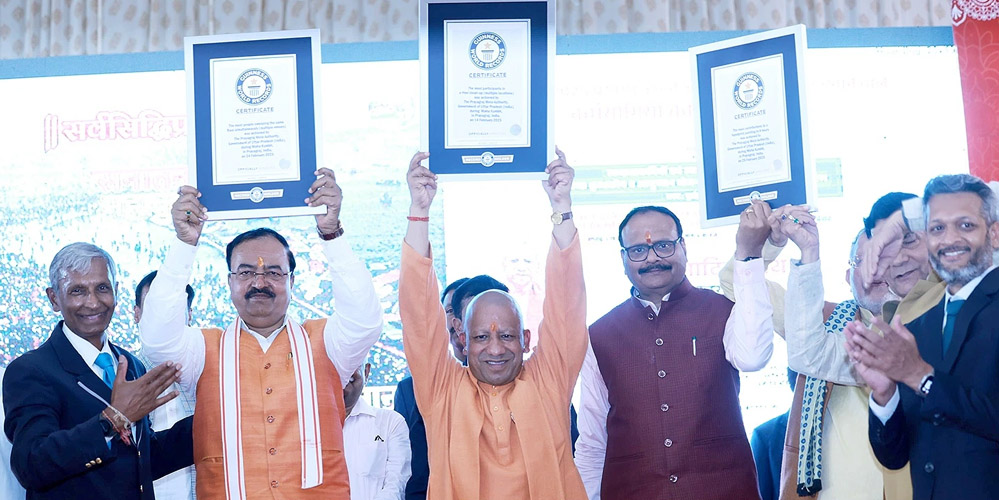 महाकुंभ मेला के समापन समारोह के मौके पर मुख्यमंत्री योगी आदित्यनाथ को गिनीज बुक ऑफ वर्ल्ड रिकॉर्ड की ओर से मेला प्राधिकरण की तरफ से बनाए गए तीन वर्ल्ड रिकॉर्ड्स का प्रमाणपत्र भी प्रदान किया गया। इन तीन वर्ल्ड रिकॉर्ड्स में से पहला एक साथ सर्वाधिक लोगों (329) की ओर से एक ही समय में कई स्थलों पर नदी की सफाई करना रहा। दूसरा एक साथ सर्वाधिक संख्या (19 हजार) में सफाईकर्मियों की ओर से सफाई अभियान चलाया जाना रहा। तीसरा, 8 घंटे तक सर्वाधिक लोगों(10,102) की ओर से हैंडप्रिंट बनाने का वर्ल्ड रिकॉर्ड शामिल रहा।
