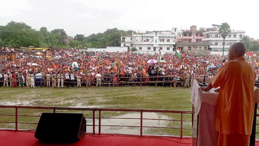 भारी बारिश के बीच सीएम योगी की रैली में उमड़ा जनसैलाब, 'जय श्री राम' और 'हर हर महादेव' के नारों से गूंजायमान हो उठा वातावरण