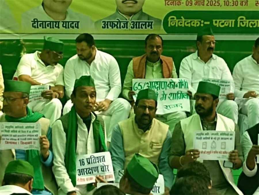 नेता प्रतिपक्ष तेजस्वी प्रसाद यादव के नेतृत्व में पटना जिला राजद की ओर से महागठबंधन सरकार के दौरान बढ़ाये गए 65 फीसदी आरक्षण को लागू किये जाने को लेकर एकदिवसीय धरना कार्यक्रम का आयोजन किया गया। रविवार को पार्टी के प्रदेश कार्यालय के समक्ष आयोजित इस धरना में पार्टी नेताओं ने राज्य और केन्द्र की एनडीए सरकार पर आरक्षण को नौवीं अनुसूची में शामिल नहीं करने, कोर्ट केस में फसाने का आरोप लगाया। इस मौके पर पार्टी के सभी प्रमुख नेता मौजूद थे।
