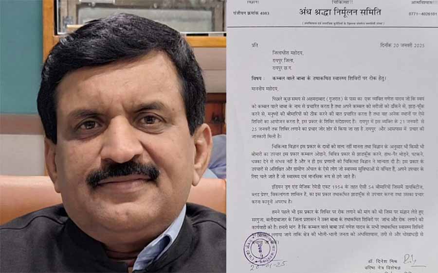 अंधश्रद्धा निर्मूलन समिति के अध्यक्ष डॉ दिनेश मिश्र ने रायपुर कलेक्टर को पत्र लिखकर कंबल वाले बाबा के तथाकथित शिविरों पर रोक लगाने की मांग की है. डॉ  मिश्र ने पत्र में कहा कि पिछले कुछ समय से अहमदाबाद (गुजरात) के पास के एक व्यक्ति गणेश यादव जो कि स्वयं को कंबल वाले बाबा के नाम से प्रचारित कर रहा है और अपने कम्बल को मरीजों को ढांकने से, झाड़-फूँक करने से, मनुष्यों की बीमारियों को ठीक करने का दावा करता है. इसके साथ ही वह अनेक स्थानों पर ऐसे शिविरों का आयोजन भी करता है. डॉ. मिश्र ने अपने पत्र में इस प्रकार के शिविरों को संदेहास्पद लिखा है.