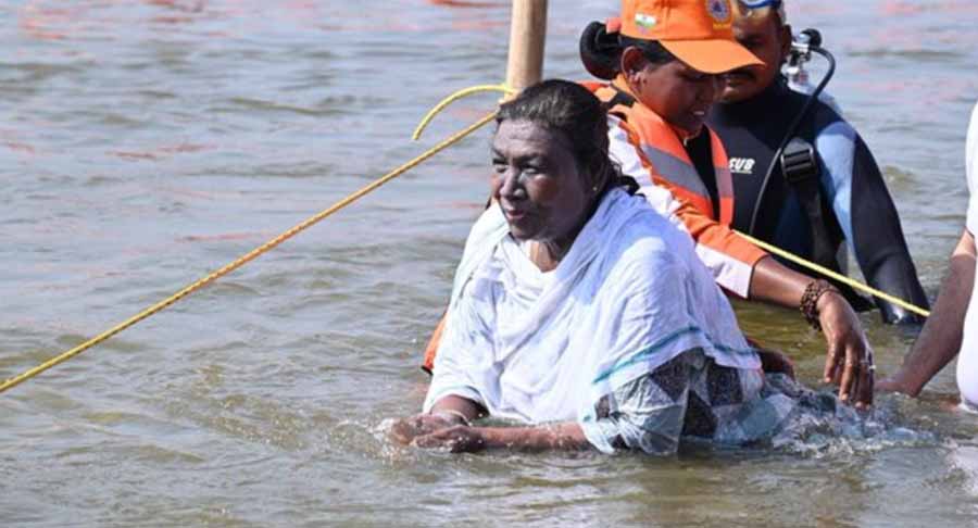 राष्ट्रपति द्रौपदी मुर्मू ने त्रिवेणी संगम में पवित्र डुबकी लगाई। त्रिवेणी संगम में पवित्र स्नान करने के बाद राष्ट्रपति द्रौपदी मुर्मू ने पूजा-अर्चना की। राष्ट्रपति मुर्मू सुबह 11 बजे दिल्ली से विशेष विमान से प्रयागराज के बमरौली एयरपोर्ट पर पहुंची। इसके बाद वे हेलिकॉप्टर से अरैल स्थित डीपीएस हेलीपैड पर उतरी। जिसके बाद राष्ट्रपति कार में सवार होकर अरैल घाट पहुंची और पूरे विधि विधान के साथ संगम में आस्था की डुबकी लगाई। इस दौरान राज्यपाल आनंदीबेन पटेल उनके साथ मौजूद रही।