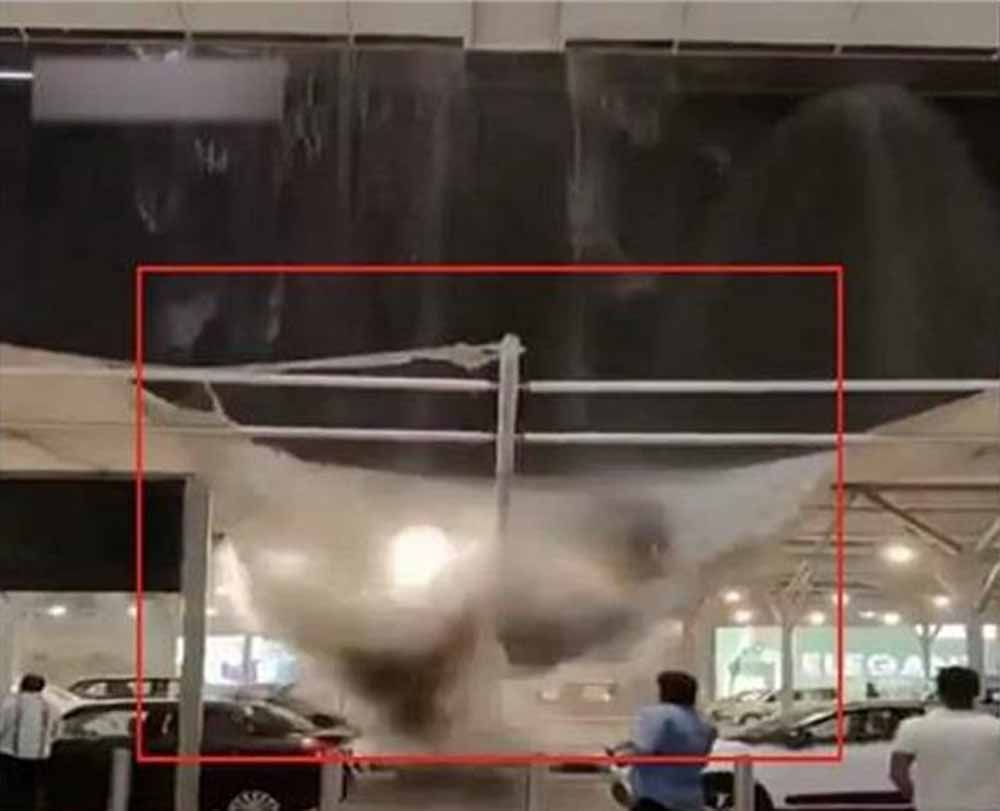 दिल्ली हवाई अड्डे पर तेज बारिश और आंधी के कारण टर्मिनल के बाहर छत का एक हिस्सा यानी ओवरहैंग नीचे गिर गया