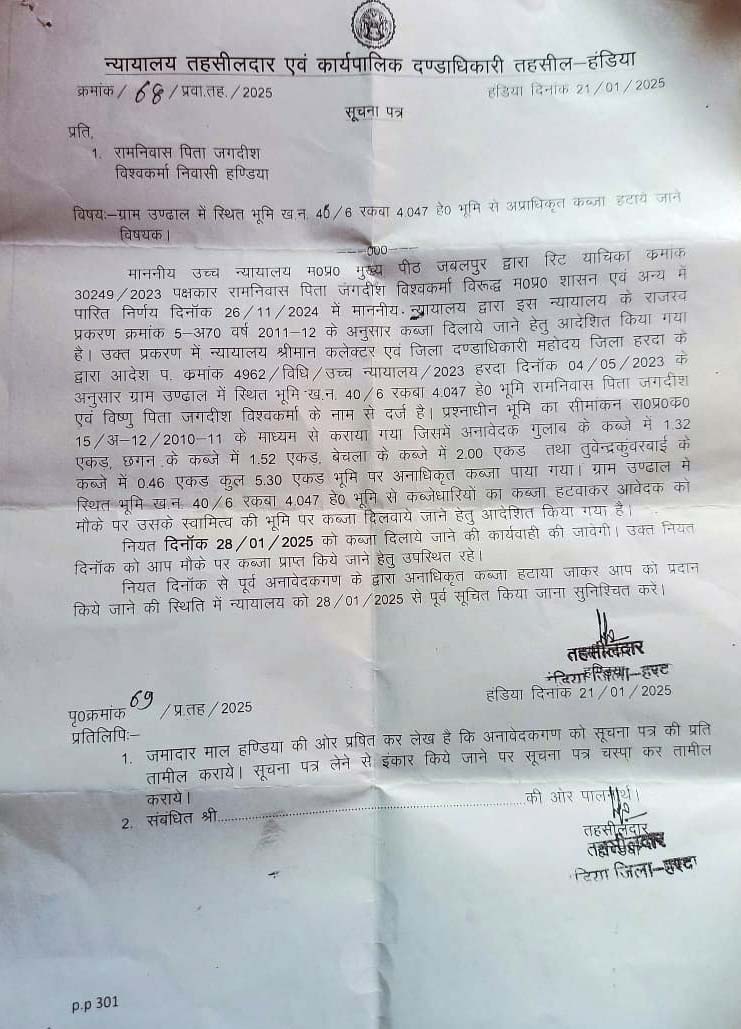 मध्य प्रदेश मे ही नही बल्कि समूचे भारत मे राजस्व संबंधित जमीन - जायदाद या प्रॉपर्टी वाले मामले पूर्णतया लंबित चलते रहते हैं। लेकिन मामला अगर न्यायालय तक पहुंच जाए और न्यायालय संबंधित अधिकारी को आदेश कर दें तो पूर्ण रूप से यह माना जाता है कि उसका निराकरण सभवतः हो गया है । लेकिन मध्य प्रदेश के हरदा जिले का एक ऐसा ही मामला प्रकाश में आया है। जहां पर जबलपुर उच्च न्यायालय ने प्रशासनिक अधिकारियों को 10 एकड़ पर फरियादी को कब्जा दिलाने की बात कही है, परंतु उक्त मामले मे देरी हो रही है । हरदा जिले के तहत तहसील हंडिया मे ग्राम उन्ढाल के किसान रामनिवास पिता जगदीश विश्वकर्मा के द्वारा उच्च न्यायालय जबलपुर मे रिट पिटीशन दायर की थी । कोर्ट ने रामनिवास को कब्जा दिलाने के लिए संबंधितों को आदेश किया था , जिसकी तारीख 28 जनवरी थी। लेकिन अभी तक वहाँ कोई प्रशासनिक अधिकारी नही पहुँचा । उस जमीन पर तीन लोगों का कब्जा बताया जा रहा है । जानकारी के मुताबिक आवेदक पूर्व मंत्री का गरीबी बताया जा रहा है।