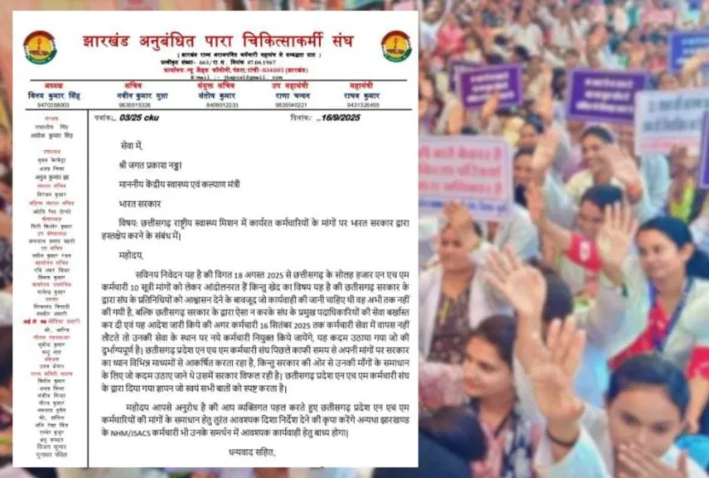 शिकायत में बताया गया कि 18 अगस्त 2025 से छत्तीसगढ़ के 16 हजार एनएचएम कर्मचारी अपनी 10 सूत्री मांगों को लेकर हड़ताल पर हैं। कर्मचारियों का कहना है कि सरकार ने संघ के प्रतिनिधियों को आश्वासन तो दिया, लेकिन अब तक कोई ठोस कार्रवाई नहीं की गई। इसके विपरीत सरकार ने संघ के प्रमुख पदाधिकारियों को सेवा से बर्खास्त कर दिया और आदेश जारी किया कि अगर कर्मचारी 16 सितंबर तक ड्यूटी पर वापस नहीं लौटते तो उनकी जगह नए कर्मचारियों की नियुक्ति कर दी जाएगी. इसे कर्मचारी संघ ने दुर्भाग्यपूर्ण कदम बताया है.