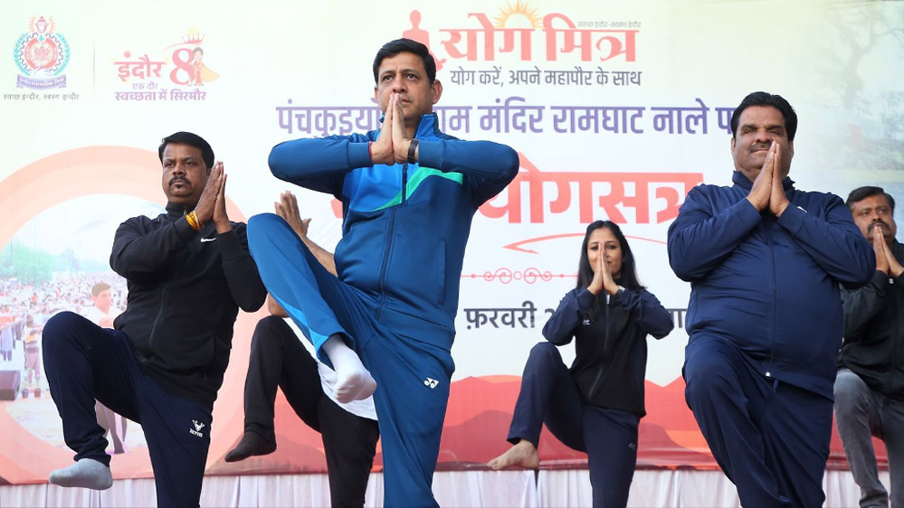देश के सबसे स्वच्छ शहर इंदौर के सार्थक प्रयासों द्वारा शहर के नालों को इतना स्वच्छ बना दिया गया है कि अब उनमें विभिन्न प्रकार के आयोजन किए जा सकते हैं।इसी क्रम में महापौर श्री पुष्यमित्र भार्गव एवं प्रदेश के अन्य महापौरों के साथ पंचकुइयाँ स्थित श्रीराम मंदिर रामघाट पर सूखे नाले में योगमित्र अभियान के अंतर्गत योग सत्र प्रारंभ हुआ।इस अवसर पर सिंगरौली की महापौर श्रीमती रानी अग्रवाल जी संत श्री रामगोपाल महाराज जी एमआईसी सदस्य अश्विनी शुक्ल स्थानीय पार्षद संध्या यादव पार्षद भारत रघुवंशी महापौर प्रतिनिधि शैलू देव सहित बड़ी संख्या में योग मित्र सम्मिलित हुए