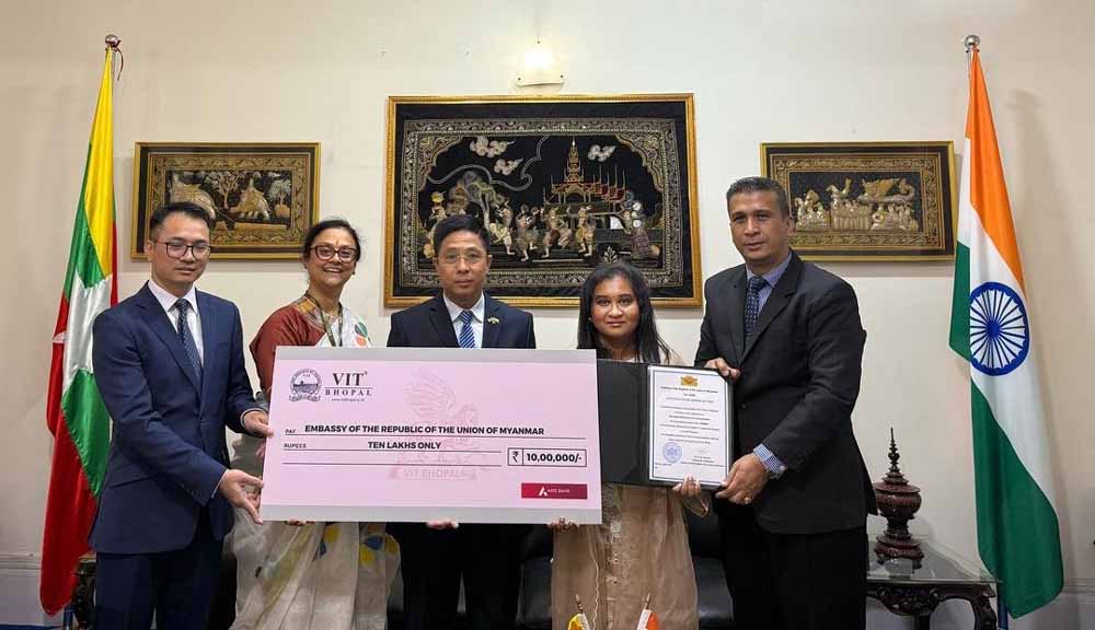 यह योगदान वीआईटी भोपाल की ओर से दिया गया और इसे म्यांमार गणराज्य के राजदूत, महामहिम ज़ॉ ओ को 24 अप्रैल 2025 गुरुवार के दिन नई दिल्ली स्थित म्यांमार दूतावास में औपचारिक रूप से सौंपा गया। यह सहयोग वैश्विक मानवीय संवेदनाओं के प्रति वीआईटी भोपाल की सतत प्रतिबद्धता को रेखांकित करता है तथा संस्थान के सहानुभूति आधारित वैश्विक दृष्टिकोण को प्रतिबिंबित करता है।