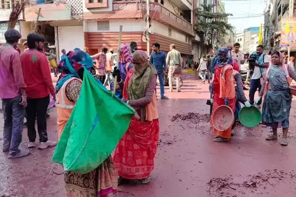 इंदौर में जहां-जहां से गेर गुजरी, वहां रंग और कीचड़ हो गया था। गेर निकलने के बाद नगर निगम के अमले ने आज फिर से यहां की सफाई को चुनौती के रूप में लिया। नगर निगम के अपर आयुक्त अभिलाष मिश्रा की देखरेख में मुख्य स्वास्थ्य अधिकारी डॉ. अखिलेश उपाध्याय द्वारा राजवाड़ा क्षेत्र और आसपास की गलियों में सफाई का अभियान प्रारंभ किया गया। मौके पर नगर निगम आयुक्त शिवम वर्मा और अपर आयुक्त रोहित सिसोनिया भी सफाई कर्मियों का हौसला बढ़ाने पहुंचे। नगर निगम के सफाई कर्मी वाकई सम्मान के पात्र हैं कि उन्होंने राजबाड़ा क्षेत्र की सफाई मात्र 38 मिनट में पूरी कर ली।