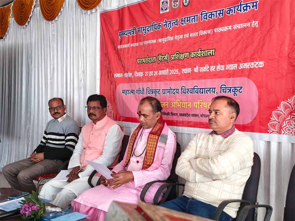 मध्यप्रदेश जन अभियान परिषद एवं महात्मा गांधी ग्रामोदय विश्वविद्यालय चित्रकूट के संयुक्त तत्वाधान में आयोजित मुख्यमंत्री सामुदायिक नेतृत्व क्षमता विकास कार्यक्रम अंतर्गत संचालित बैचलर एवं मास्टर ऑफ सोशल वर्क के शहडोल संभाग के परामर्शदाताओं का आज श्री नर्मदे हर सेवा न्यास अमरकंटक में 02 दिवसीय आवासीय प्रशिक्षण कार्यशाला का शुभारंभ राज्य कोल विकास प्राधिकरण के अध्यक्ष (केबिनेट मंत्री दर्जा) श्री रामलाल रौतेल की अध्यक्षता व माँ नर्मदा मन्दिर के पुजारी श्री धनेश वंदे महराज के मुख्य आतिथ्य में हुआ।