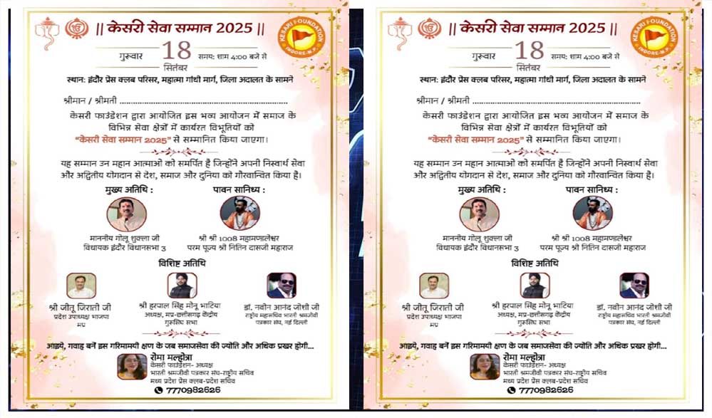समाज सेवा और राष्ट्र सेवा के विभिन्न क्षेत्रों में उल्लेखनीय योगदान देने वाली 21 प्रतिभाशाली हस्तियों को “केसरी सेवा सम्मान 2025” से अलंकृत किया जाएगा। यह भव्य समारोह 18 सितंबर 2025, शाम 4 बजे इंदौर प्रेस क्लब परिसर में आयोजित होगा।