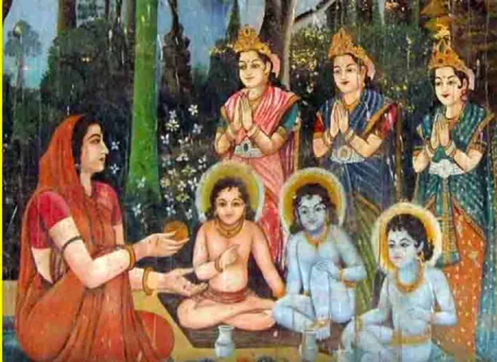 इधर काफी समय बीत जाने पर भी तीनों देव नहीं लौटे तो तीनों देवियों को चिंता हुई। वे नारदजी को साथ लेकर अनुसूया के आश्रम पहुंची। वहां देखा कि तीनों देव तो शिशु रूप में पालने में हैं। उन्होंने अनुसूया से क्षमा मांगते हुए अपने पतियों को उनके मूल स्वरूप में लौटा देने की प्रार्थना की। अनुसूया ने उन शिशुओं पर जल छिड़क कर पहले जैसा कर दिया। त्रिदेव ने उन्हें वरदान देते हुए कहा कि वे तीनों ‘दत्तात्रेय’ के रूप में उनके पुत्र होंगे। इस दिन महिलाएं अपने पति के दीर्घ जीवन की कामना से सती अनुसूया का व्रत और पूजन करती हैं।