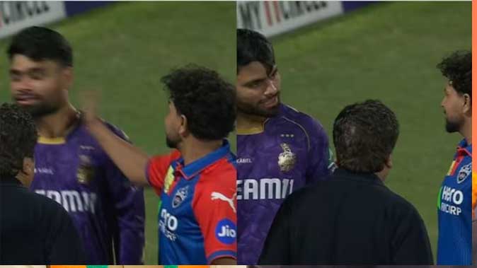इस मुकाबले के बाद मंगलवार को सोशल मीडिया पर एक वीड‍ियो क्लिप वायरल हुई. जहां मैच खत्म होने कुछ पल बाद ही दिल्ली कैप‍िटल्स के स्प‍िनर कुलदीप यादव को लाइव टीवी पर केकेआर के बल्लेबाज रिंकू सिंह को दो बार थप्पड़ मारते हुए देखा गया