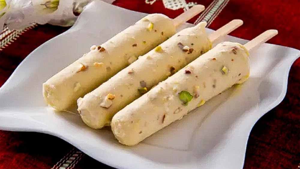 कुल्फी जम जाने के बाद मोल्ड को थोड़ी देर पानी में डुबोएं, फिर कुल्फी बाहर निकालें और सर्व करें।