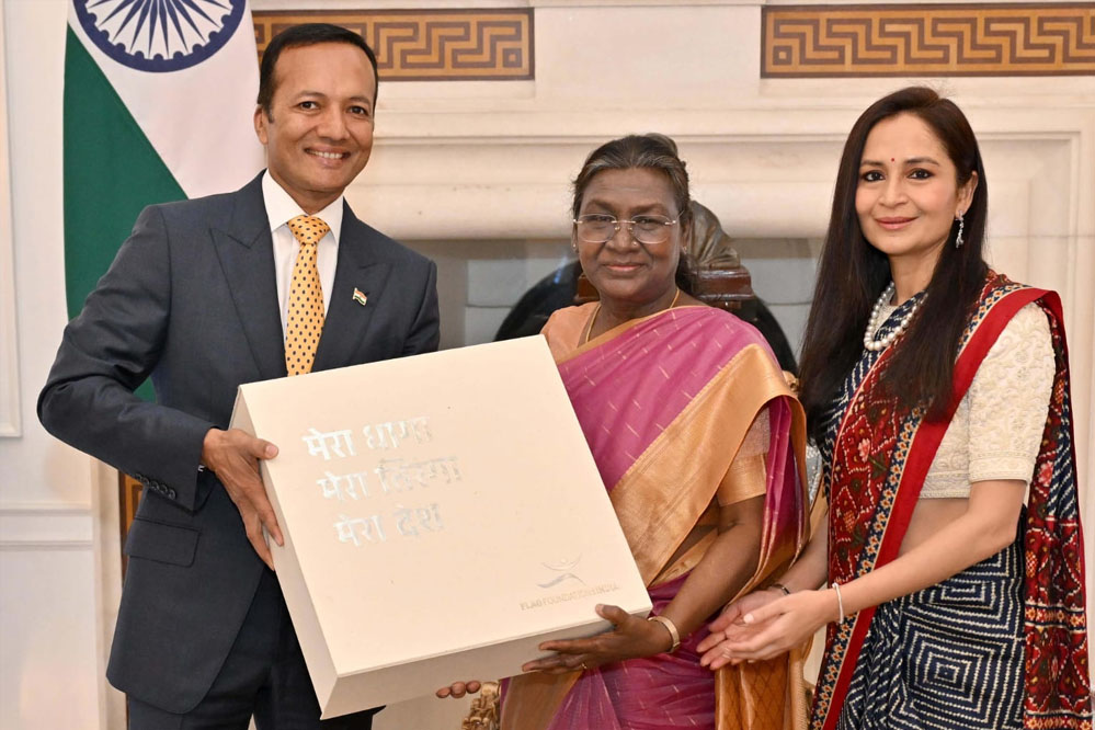 नवीन जिन्दल और शालू जिन्दल ने लोगों के धागे से तैयार राष्ट्रीय ध्वज माननीय राष्ट्रपति को भेंट किया