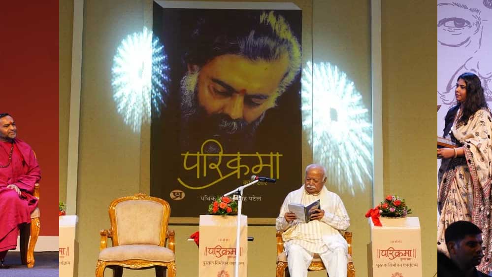 विमोचन कार्यक्रम के मुख्य अतिथि डॉ. भागवत ने कहा, ‘नर्मदा परिक्रमा में जो कुछ प्रहलाद जी को बोध मिला होगा, उस बोध (पुस्तक) को सरसरी तौर पर जो मैंने पढ़ा है, उसमें तो यही है कि मैं और मेरा छोड़ो; अंतःकरण पवित्र करो. स्वार्थ बिल्कुल मत रखो. कर्तव्य, कर्म करते चलो, सबको अपना मानकर चलते जाओ.’