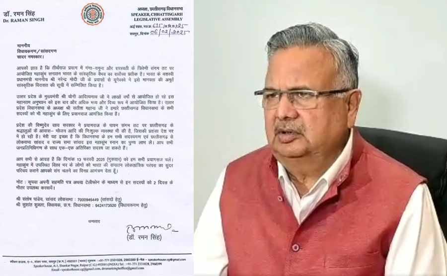 विधानसभा अध्यक्ष डॉ. रमन सिंह ने प्रदेश के विधायकों और सांसदों को महाकुंभ में स्नान के लिए 13 फरवरी को प्रयागराज चलने का आमंत्रण दिया है. यात्रा के लिए सांसद संतोष पांडेय और विधायक सुशांत शुक्ला से संपर्क करने को कहा गया है.