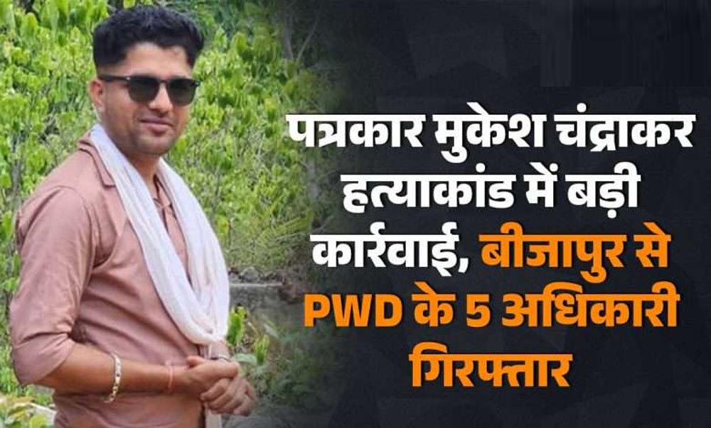 PWD के 5 अधिकारी गिरफ्तार: बीजापुर के पत्रकार मुकेश चंद्राकर की हत्या का आरोप सड़क बनाने वाले ठेकेदार पर लगा था. मुकेश चंद्राकर ठेकेदार के बनाए सड़क के खिलाफ अपने सोशल मीडिया और वीडियो पोर्टल पर खबर प्रकाशित कर रहे थे. आरोप है कि इसी बात से नाराज होकर ठेकेदार ने उनकी हत्या करा दी. हत्याकांड का मुख्य आरोपी ठेकेदार सुरेश चंद्राकर मुकेश चंद्राकर का रिश्तेदार था.
