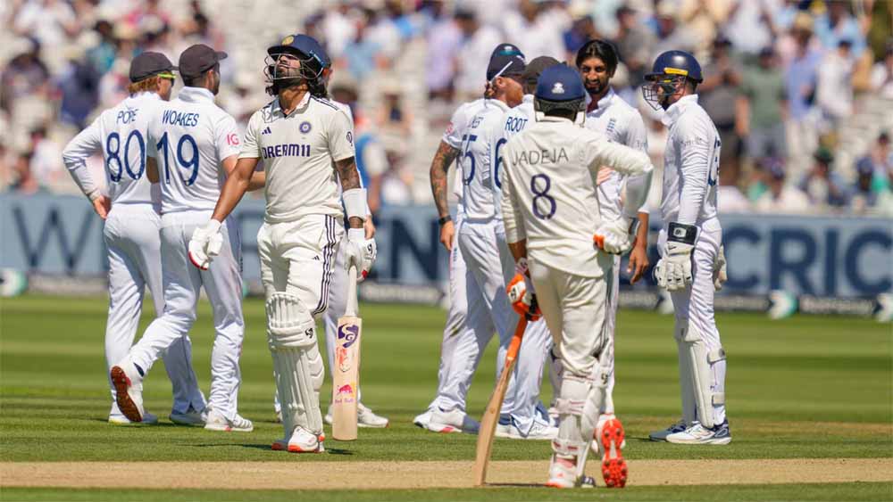 भारत और इंग्लैंड के बीच पांच मैचों की टेस्ट सीरीज का तीसरा मैच लॉर्ड्स क्रिकेट ग्राउंड पर खेला जा रहा है। इंग्लैंड ने पहले बल्लेबाजी करते हुए 387 रन बनाए, इसके जवाब में भारत ने पहली पारी में पांच विकेट गंवा दिए हैं। ऋषभ पंत 112 गेंद में 74 रन बनाकर रन आउट हुए। राहुल और पंत के बीच चौथे विकेट के लिए 198 गेंद में 141 रन की साझेदारी हुई। केएल राहुल 100 रन बनाकर शोएब बशीर का शिकार हुए। तीसरे दिन टी ब्रेक तक नीतीश रेड्डी (25) और रविंद्र जडेजा (40) क्रीज पर मौजूद हैं।
