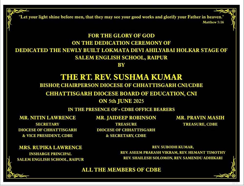 सलेम इंग्लिश स्कूल, रायपुर में दिनांक 5 जून 2025 को एक ऐतिहासिक और गौरवपूर्ण क्षण का साक्षी बना, जब छत्तीसगढ़ डायोसिस बोर्ड ऑफ एजुकेशन (CDBE) के अंतर्गत निर्मित नवीन मंच को 'लोकमाता देवी अहिल्याबाई होलकर मंच' के नाम से समर्पित किया गया।