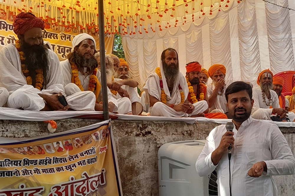 हाइवे को सिक्सलेन बनाने, गो अभ्यारण की मांग को लेकर शहर के खंडा रोड पर संतों का अखंड आंदोलन छठवें दिन भी जारी रहा। इस मांग को लेकर आठ संतों की भूख हड़ताल दूसरे दिन भी जारी रही। वहीं अन्न त्यागकर धरने पर बैठे संत प्रेमदास महाराज गोहद की अचानक से तबीयत बिगड़ गई। उन्हें उपचार के लिए जिला अस्पताल में भर्ती कराया गया। चिकित्सकों का कहना था कि संत का बीपी बढ़ा हुआ है। अखंड आंदोलन के छठवें दिन कांग्रेस के उपनेता प्रतिपक्ष एवं अटेर विधायक हेमंत कटारे मंगलवार को कांग्रेसी कार्यकर्ताओं के साथ आंदोलन स्थल पर पहुंचे। उन्होंने संतों के समक्ष हाथ जोड़कर प्रार्थना करते हुए भूख हड़ताल खत्म करने का आग्रह किया।