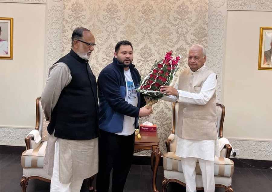 बिहार विधानसभा में प्रतिपक्ष और राष्ट्रीय जनता दल (राजद) के वरिष्ठ नेता तेजस्वी प्रसाद यादव ने बुधवार को राज्यपाल आरिफ मोहम्मद खान से मुलाकात की। इस मुलाकात से राजनीतिक हलचल मच गई है। बताया जा रहा है कि तेजस्वी यादव ने प्रदेश की विधि व्यवस्था को लेकर राज्यपाल को ज्ञापन सौंपा है।