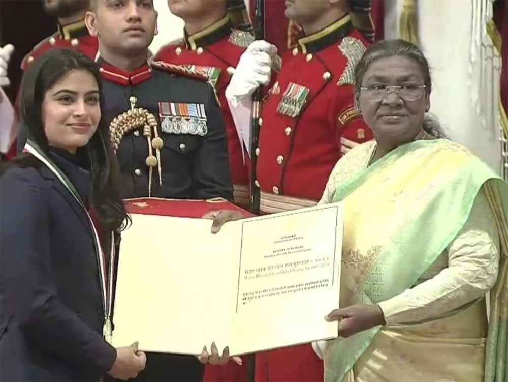 दो ओलंपिक पदक जीतने वाली निशानेबाज मनु भाकर और शतरंज वर्ल्ड चैंपियन डी गुकेश शुक्रवार को राष्ट्रीय खेल पुरस्कार समारोह में राष्ट्रपति द्रौपदी मुर्मू से जब मेजर ध्यानचंद खेलरत्न सम्मान लेने पहुंचे तो तालियों की गड़गड़ाहट के साथ उनका स्वागत किया गया। इनके अलावा भारतीय पुरूष हॉकी टीम के कप्तान हरमनप्रीत सिंह और पैरालम्पिक गोलड मेडलिस्ट हाई जंप के खिलाड़ी प्रवीण कुमार को भी देश का सर्वोच्च खेल सम्मान यहां राष्ट्रपति भवन में प्रदान किया गया।
