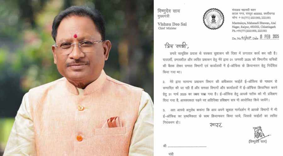 मुख्यमंत्री विष्णुदेव साय ने पत्र में 1 जनवरी को विभागीय सचिवों की बैठक में तमाम शासकीय विभागों में ई-ऑफिस के क्रियान्वयन के लिए निर्देशित किए जाने का जिक्र किया. इसके साथ ही बताया कि वे स्वयं सामान्य प्रशासन विभाग की अधिकतर फाइलें ई-ऑफिस के माध्यम से सम्पादित कर रहे हैं.
