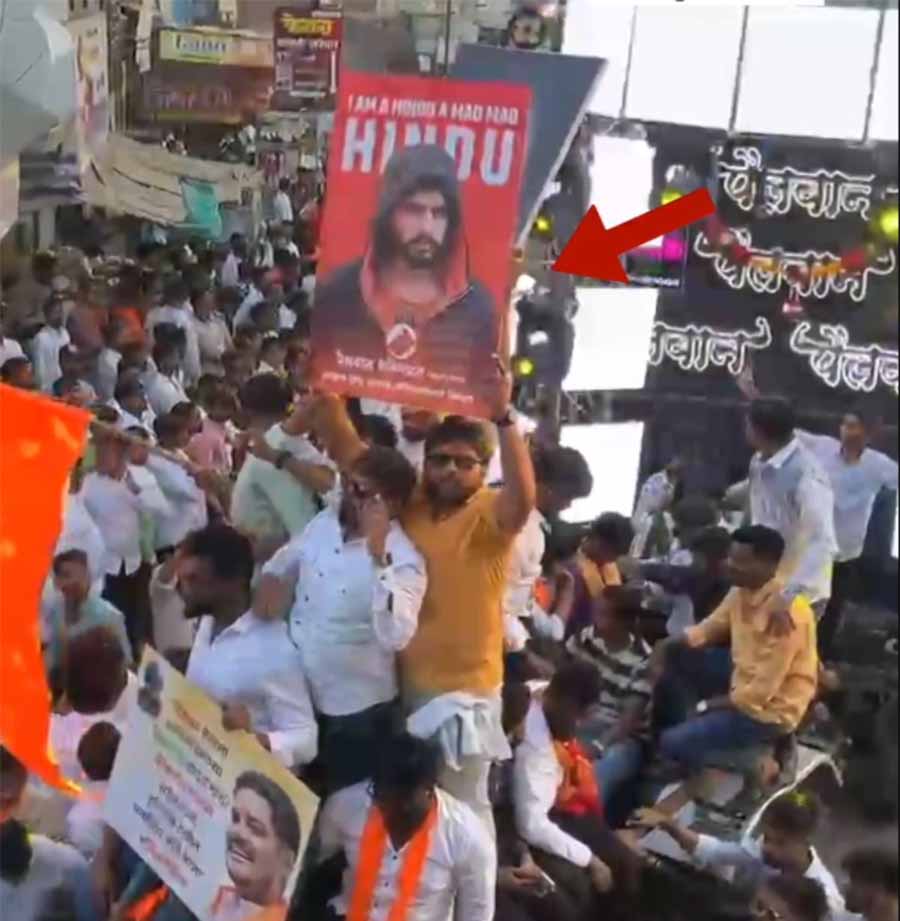 अहिल्यानगर का जो वीडियो सामने आया है उसमें छत्रपति शिवाजी महाराज की जयंती पर निकाले जुलूस में एक युवक लॉरेंस बिश्नोई का पोस्टर लहरा रहा है, जिसपर “I am Hindu” लिखा है। हैरत की बात ये है कि उस पोस्टर में दूसरी तरफ बीजेपी नेता और मंत्री नितेश राणे की तस्वीर है, जिन्हें “जिहादियों का बाप” बताया गया है। वहीं संभाजी नगर में लिखा गया था कि “हम गांधी को नहीं छत्रपति शिवाजी महाराज और महाराणा प्रताप जैसी आंधी को मानने वाले हैं।