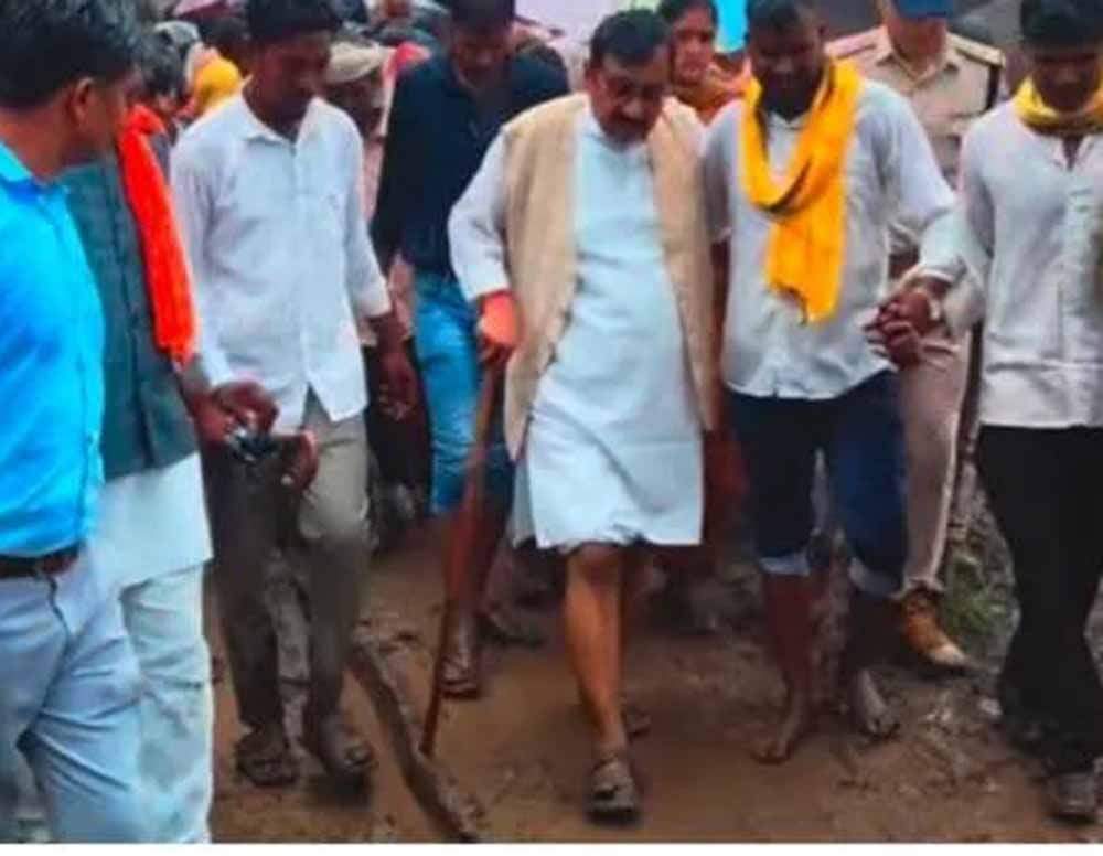 कीचड़ भरे रास्तों से होते हुए मंत्री विजय शाह किसी तरह गांव पहुंचे