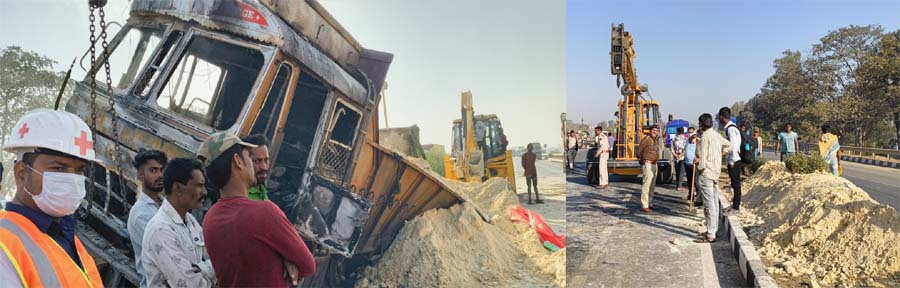 जानकारी के मुताबिक, हादसे के दौरान जिप्शम से भरे ट्रक का टायर फटने के कारण ड्राइवर और खलासी वाहन से नीचे उतरे हुए थे, तभी पीछे से आ रहे ट्रेलर ने ट्रक को जोरदार टक्कर मार दी. टक्कर इतनी जबरदस्त थी कि दोनों वाहनों में तुरंत आग लग गई.