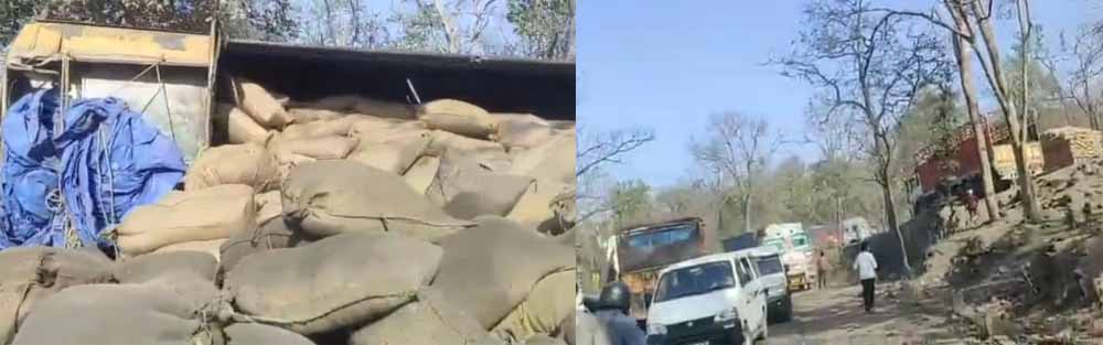 पेंड्रा बिलासपुर मुख्यमार्ग पर धान से लदा ट्रक पलटा, लगा लंबा जाम