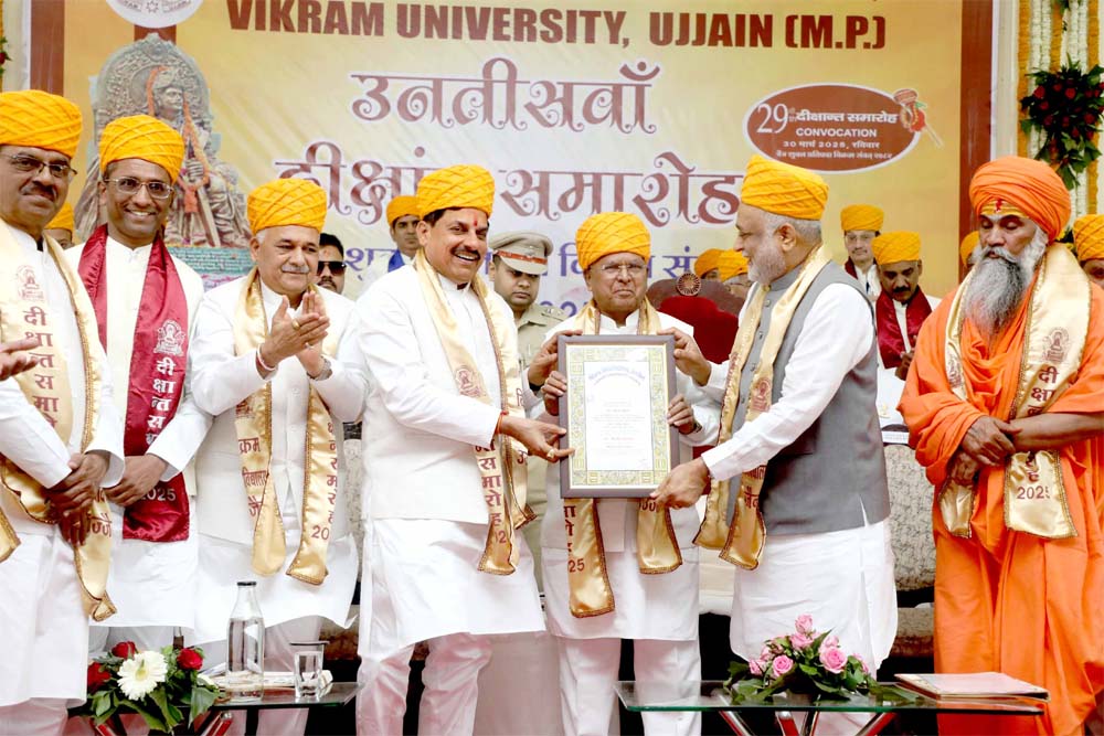 राज्यपाल श्री मंगुभाई पटेल और मुख्यमंत्री डॉ. मोहन यादव की उपस्थिति में रविवार को विक्रम विश्वविद्यालय उज्जैन का 29वां दीक्षांत समारोह आयोजित हुआ। स्वर्ण जयंती सभागार में आयोजित समारोह में मुख्यमंत्री डॉ. यादव और हार्टफुलनेस संस्था के संस्थापक श्री कमलेश पटेल को विश्वविद्यालय द्वारा डी-लिट की मानद उपाधि प्रदान की गई। साथ ही 70 विद्यार्थियों को उपाधि, 99 को मेडल और 2 शोधार्थियों को डी-लिट उपाधि प्रदान की गई।