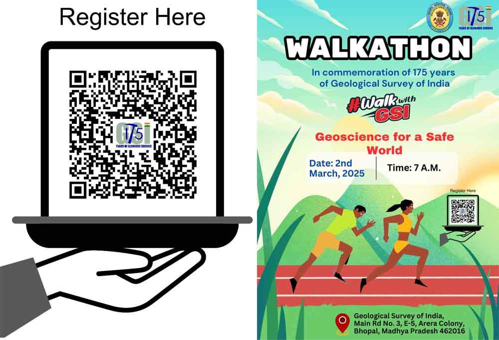 भारतीय भूवैज्ञानिक सर्वेक्षण (GSI) की 175वीं वर्षगांठ के अवसर पर GSI द्वारा 02 मार्च 2025 सुबह 7:00 बजे 3.0 किलोमीटर की वॉकथॉन का आयोजन किया जा रहा है जो बिठ्ठल मार्केट से कैम्पियन स्कूल होते हुए मनीषा मार्केट रोड से वापस होगी व बिठ्ठल मार्किट पर समाप्त होगी। इस वॉकथॉन में रजिस्ट्रेशन के लिए QR कोड के माध्यम से पंजीकृत कराया जा सकता है। श्री विजय दुबे, सहायक पुलिस आयुक्त, कार्यक्रम के मुख्य अतिथि रहेंगे ।